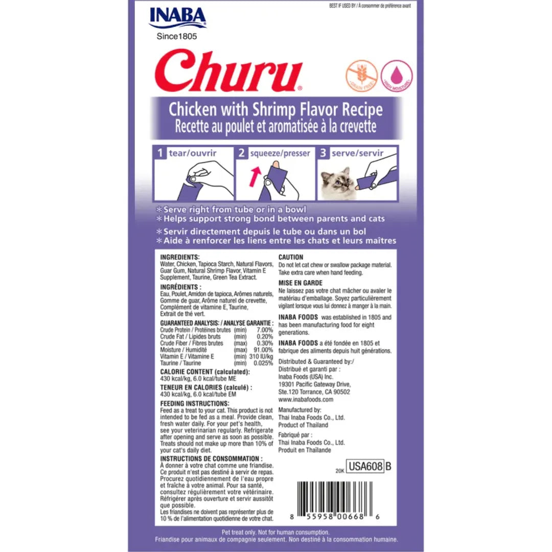 Inaba Churu Chicken with Shrimp Recipe Cat Treat 56g is a delectable treat for all breeds of cats. It is made of 100% pure and natural wild Tuna or Farm that offers good protein content for the cats to build strong muscles. The treat is also rich in fibre for ensuring good digestive health in the cats. The high moisture content of this treat ensures excellent hydration in your felines. To feed this treat to your cat, all you need to do is open the tube and give a little squeeze to feed these treats by hand. You can also pour the treat into a bowl or use a topper for your wet or dry cat food. Inaba Churu Chicken With Shrimp Recipe is an excellent treat, especially when you are administering pills to your cats, as you can feed it alongside them.