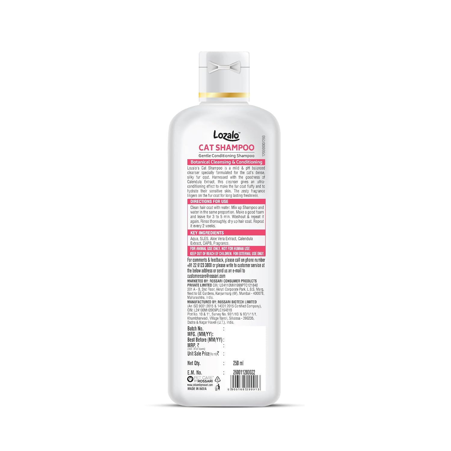 Lozalo Botanical Conditioning Cat Shampoo is a high-quality cat shampoo that offers a luxurious grooming experience for your cats. The shampoo combines the hydrating power of Calendula Extract with a gentle cleansing formula. This specially designed shampoo not only deeply moisturizes your cat's skin and fur but also ensures their coat remains soft, silky, and easy to manage. Its effective cleansing properties remove dirt and grime without stripping away natural oils, leaving your cat's fur with a fresh, healthy glow. Free from parabens and harsh chemicals, it's safe for regular use on cats of all breeds, minimizing the risk of skin irritation. The easy-to-lather formula makes bathing a breeze, rinsing off quickly to reduce stress for you and your pet, and resulting in a beautifully soft and shiny coat that's a pleasure to stroke.