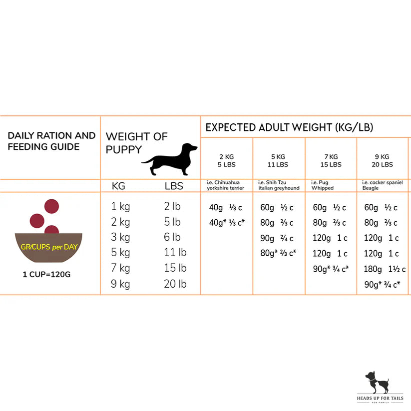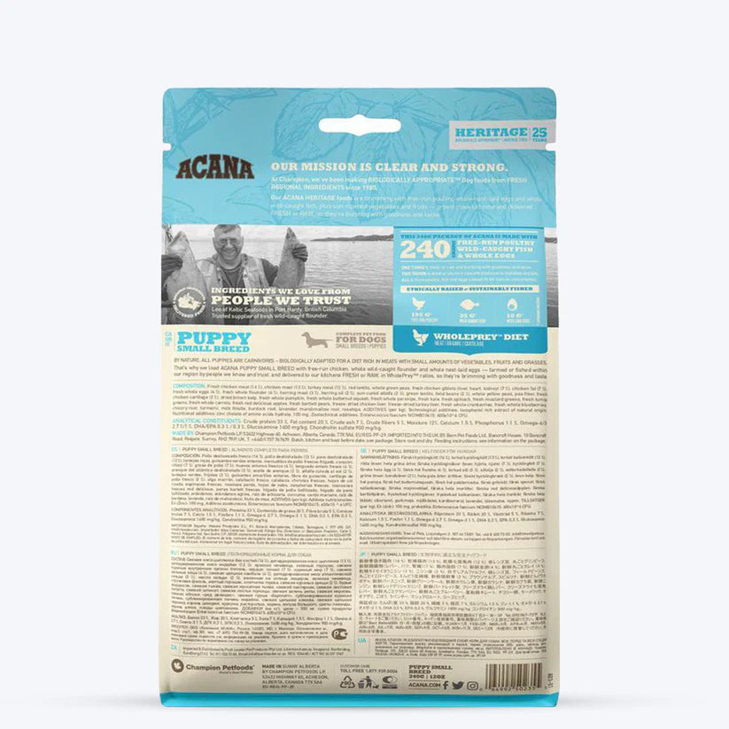 Acana Puppy Small Breed is a top-quality puppy food containing 70% meat content and is a fitting meal for small breed puppies having an adult weight of up to 9 Kg. This dog food is ideal for breeds like Dachshund, Shih Tzu, Pug, Pomeranian etc. High-quality ingredients like free-range chicken, whole nest-laid eggs, and wild-caught flounder offer a rich protein content that builds lean muscle mass and enhances skin and hair growth. Having essential vitamins and minerals, the food maintains a healthy metabolism in canines. Acana Puppy Small Breed provides a low carbohydrate content to help puppies reach and maintain optimal weight. Zinc along with essential fatty acids like Omega 3 and Omega 6 promotes skin health and gives sustained energy and shield against potential diseases. The inclusion of freeze-dried liver meat enhances the savour of the meal. Acana dog food offers canines a diet similar to their ancestors to help them flourish in the most natural way possible.