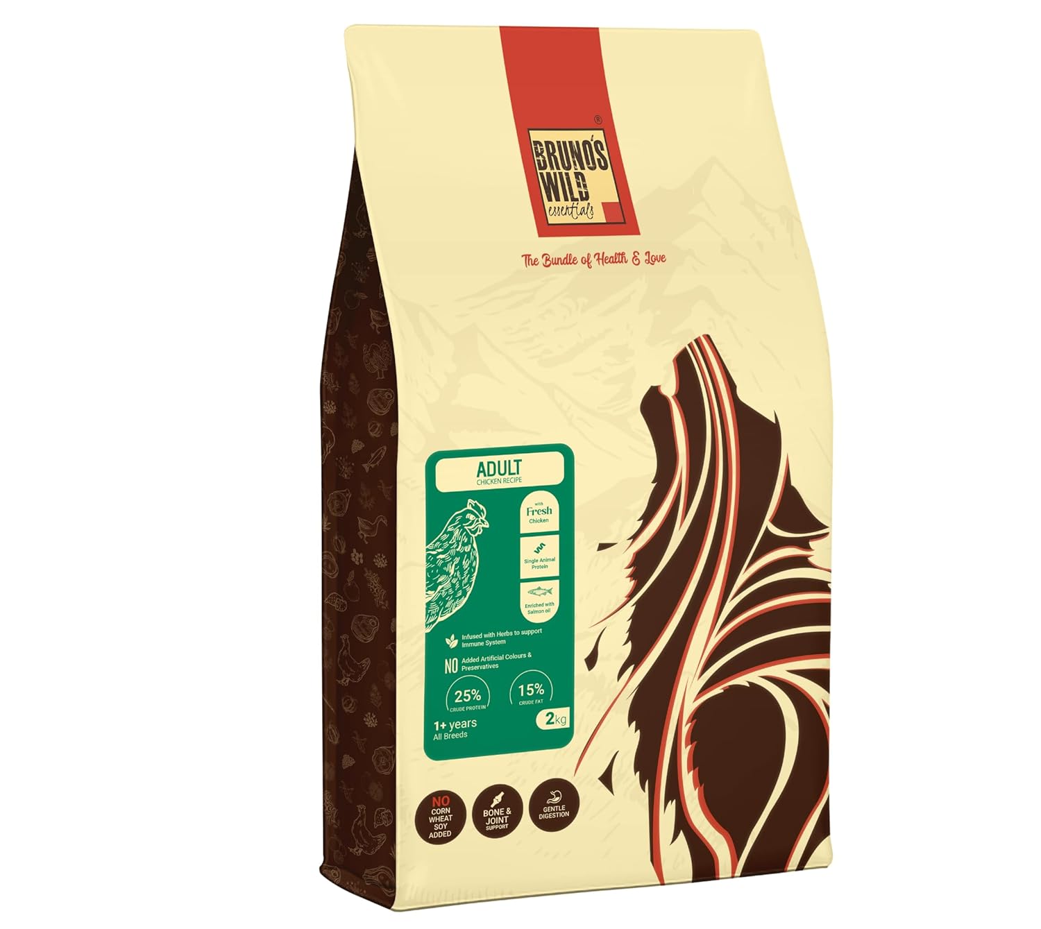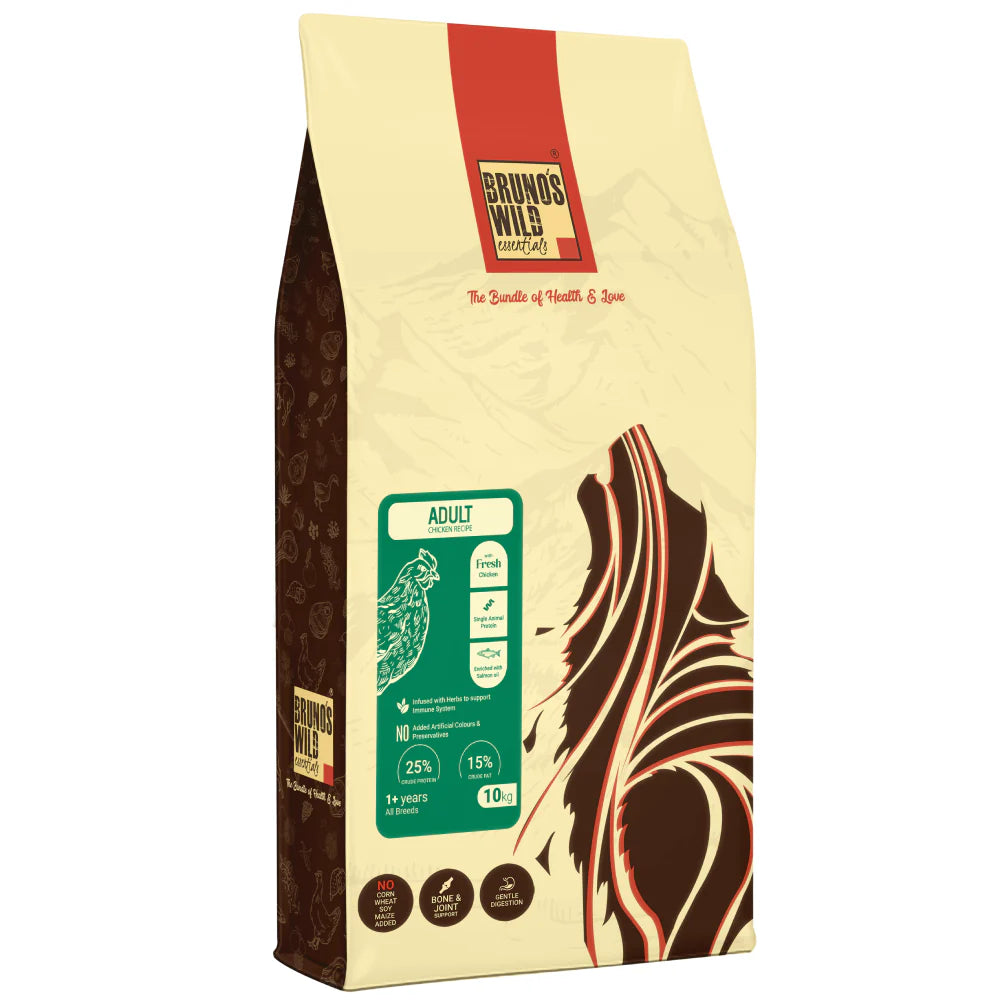 Bruno’s Wild Essentials is a nutritious and delicious dog food designed for all grown-up dogs. It has real chicken as the main constituent and has a crunchy kibble texture which promotes excellent chewing behaviour in the dogs. Chicken offers your dogs a rich protein content that helps in building their muscle mass and overall strength. Salmon oil is another ingredient in the diet that offers the dogs Omega 3 fatty acids, which nourish their overall skin health. Bruno’s Wild Essentials also contains Glucosamine and Chondroitin that support good bone and joint strength, helping the dogs to stay active and mobile. Lastly, flaxseed present in the diet offers antioxidants to boost your dog’s overall immunity to fight infections and diseases.