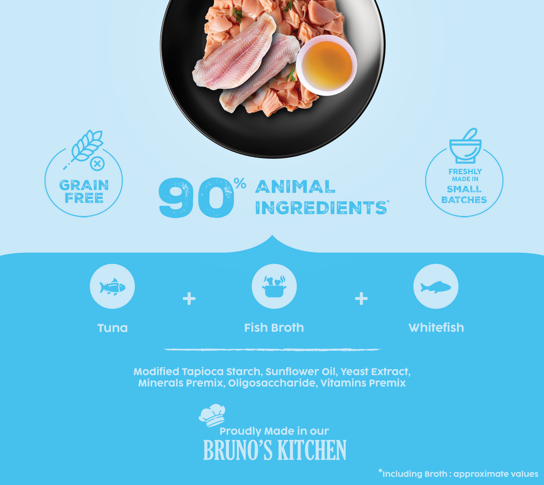 Brunos Wild Essentials Grain Free Tuna With Whitefish Wet Cat Food is a fine-quality gravy cat food ideal for all cat breeds. It consists of Tuna and Whitefish as the main ingredients, which provide good protein content to boost muscle mass and strength. This diet consists of prebiotics and is loaded with vitamins and minerals for promoting good digestive health and immunity in the felines. It also consists of Taurine, which also helps support a healthy heart in the cats. Brunos Wild Essentials Grain Free Tuna With Whitefish Wet Cat Food has a high moisture content, which keeps the cats well-hydrated during the blistering heat of the summers.