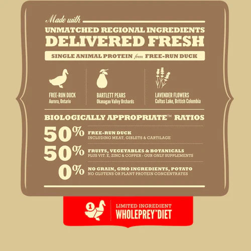 Acana Free Run Duck Dog Food is a highly nutritious dog food, having 50 % duck as the main ingredient. It has a single easily digestible animal protein that is appropriate for diet-sensitive dogs. Ingredients like fresh pear, squash and pumpkin encourage gentle and healthy digestion which also makes way for a higher nutrient absorption. This dog food has a high-quality protein content, which helps in building good muscle mass and to enhance skin and hair growth. Having an appreciable amount of freeze-dried liver in the meal attracts even the fussiest of eaters. Acana Free-Run Duck diet comprises 50% fruits and vegetables from proven, local sources sent fresh each time. Organic sea vegetables and botanicals help in sustaining a healthy metabolism in canines. Omega 3 and Omega 6 fatty acids promote a healthy skin and a shiny coat. The meal is delicately steam-cooked in its natural juices and contains no added water. Acana Dog food is a biologically applicable meal that is suitable for dogs of all breeds and life stages.