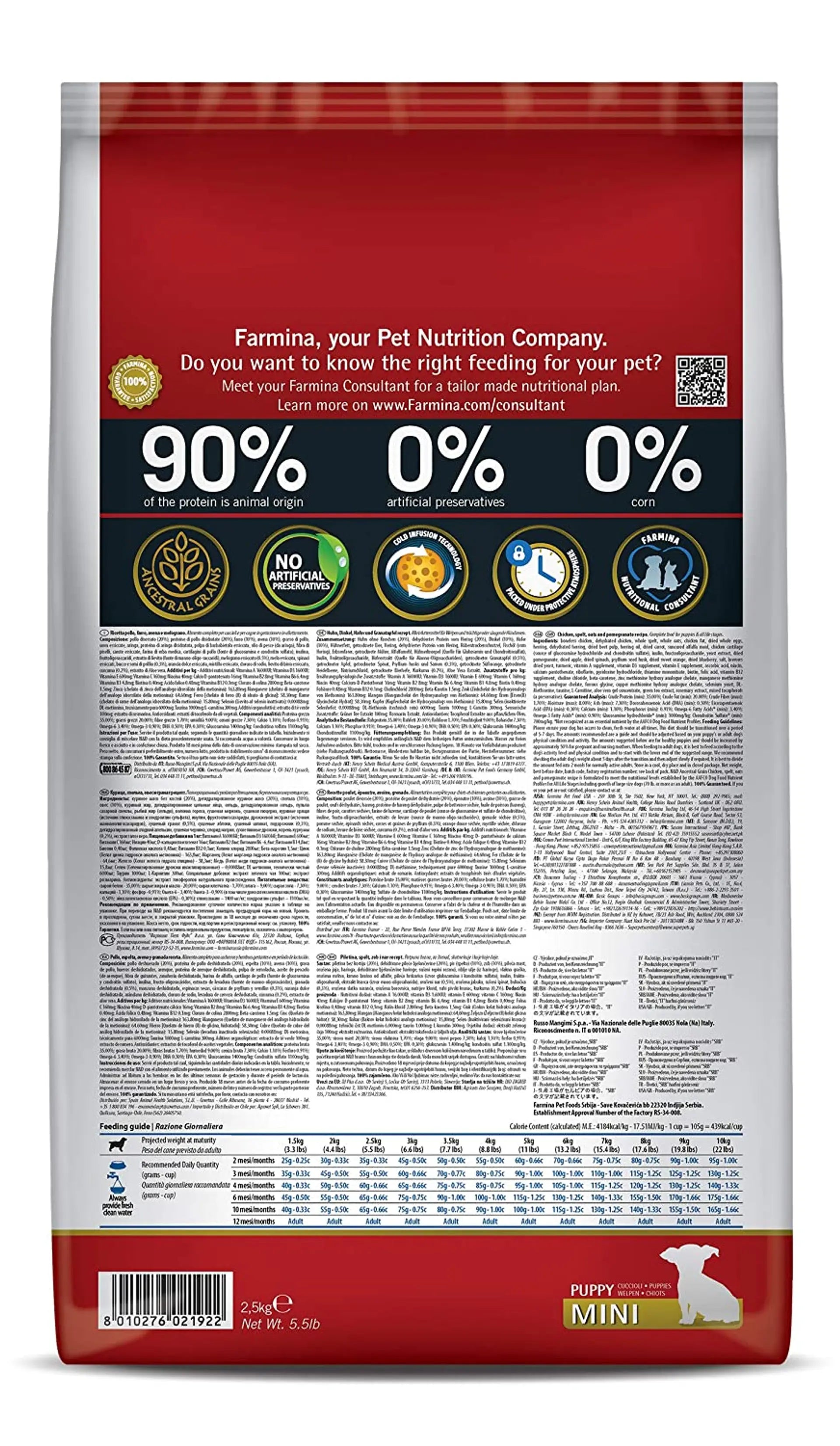 Farmina N&D Ancestral Grain Chicken & Pomegranate Dog Dry Food Puppy Mini is a premium quality puppy food for small breed puppies. You can feed this diet to puppies of breeds like Pug, Dachshund, Beagle, Pomeranian, Shih Tzu etc. The diet has the goodness of chicken with the antioxidant power of pomegranate, providing balanced nutrition for your puppy’s health. The addition of ancestral grains like spelt and oats gives essential carbohydrates, keeping your pups energetic. Farmina Chicken & Pomegranate Dog Dry Food Puppy Mini also consists of natural antioxidants, vitamins, and minerals that bolster the puppy's immune system and contribute to a lustrous coat as well.