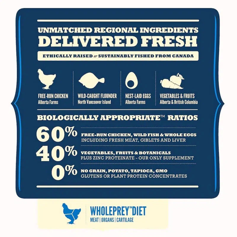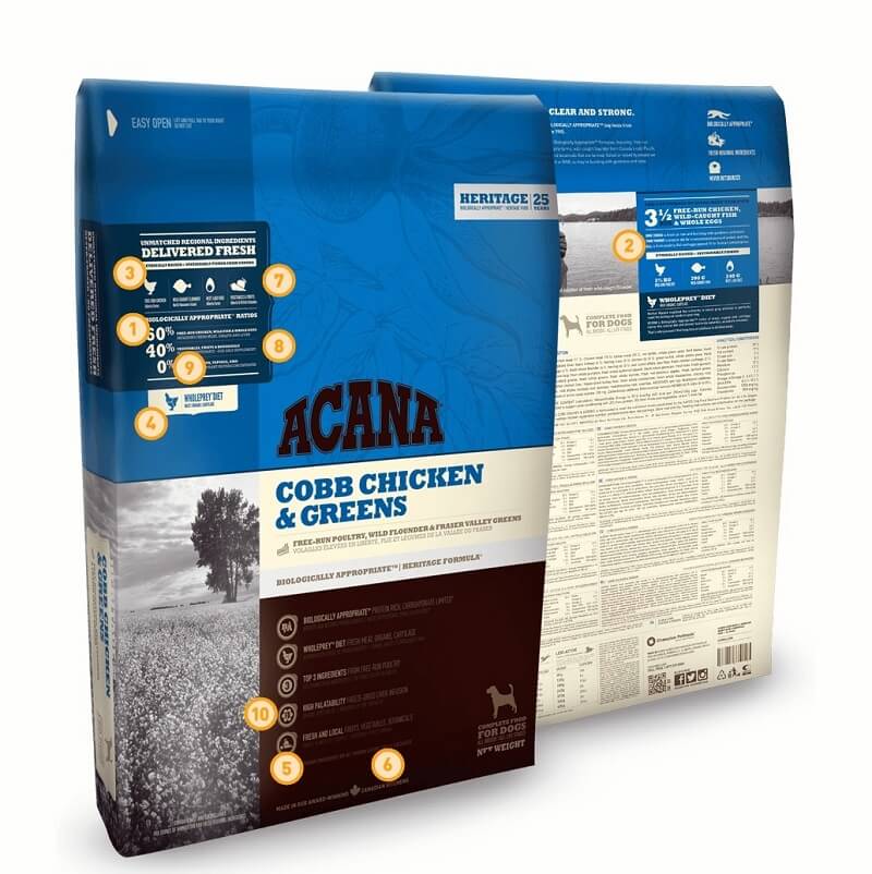 Dogs, just like their ancestors, exhibit a carnivorous nature, and they biologically thrive on a diet rich in varied fresh whole meats. Acana Adult Dog Food (formerly known as Acana Cobb Chicken and Greens) contains high-quality ingredients like free-run chicken, Wild flounder and nest-laid eggs, supplying an adequate protein content for optimal body function. Acana’s WholePrey diet reflects the dog’s natural diet in the wild. The meal consists of 40% fruits, vegetables and herbs, providing all essential vitamins and minerals to build a strong immune system in canines. Acana Adult Dog food is free from potatoes, tapioca and grains and contains locally sourced lentils and peas with a low glycemic index for maintaining a stable blood sugar level and an optimal weight. The food also includes valuable plant extracts for promoting a healthy metabolism in dogs. It is a gluten and grain-free meal containing no artificial additives.