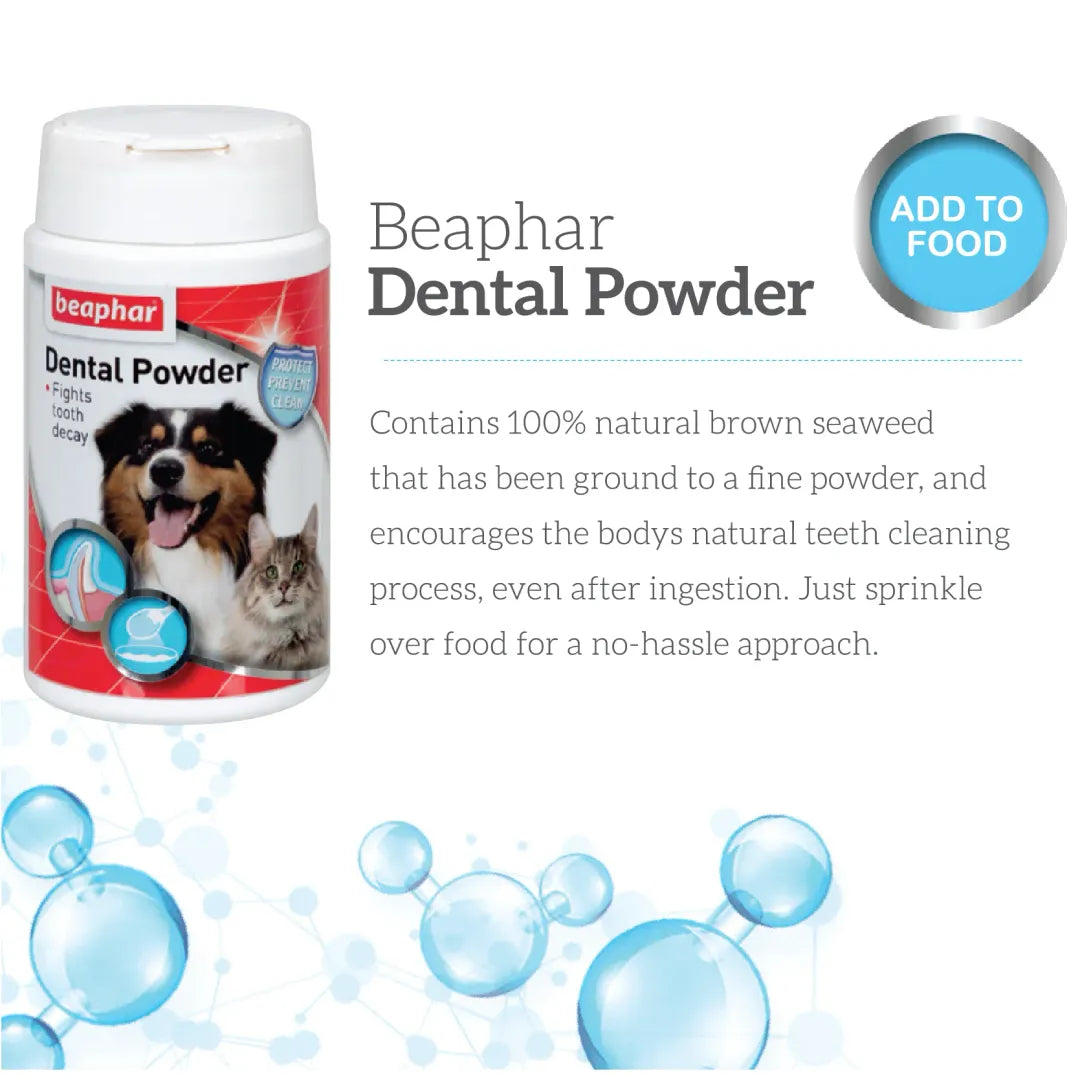 Beaphar Dental Powder is a natural and effective way to promote healthy teeth and gums for your dog or cat. Made from natural ingredients like seaweed and eucalyptus oil, this dental powder helps to prevent tartar buildup, plaque formation, and bad breath. This shampoo is easy to use, suitable for pets of all ages and sizes, and is a safer and more affordable alternative to professional dental cleaning. Regular use of Beaphar Dental Powder can help to promote better overall oral health for your pet. The 75g container is perfect for regular use and will last for several months.