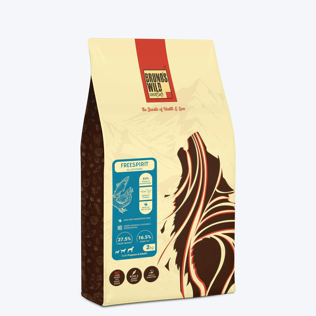 Bruno’s Wild Essentials Freespirit Salmon Chicken at PetsWorld is an optimal dog food for both puppies and adult dogs of all breeds. This dog food is an ideal source of highly digestible protein that endows dogs with strong muscle mass. Essential vitamins like Vitamin B and Vitamin D help in boosting the cardiac health of the dogs. To improve the strength of bones and joints, Glucosamine and Chondroitin have been added in adequate quantities. Bruno’s Wild Essentials Freespirit Salmon Chicken has soluble fibres in it that regulate blood sugar levels in dogs. This dog food is completely devoid of artificial flavours and preservatives making it safe for all dogs.