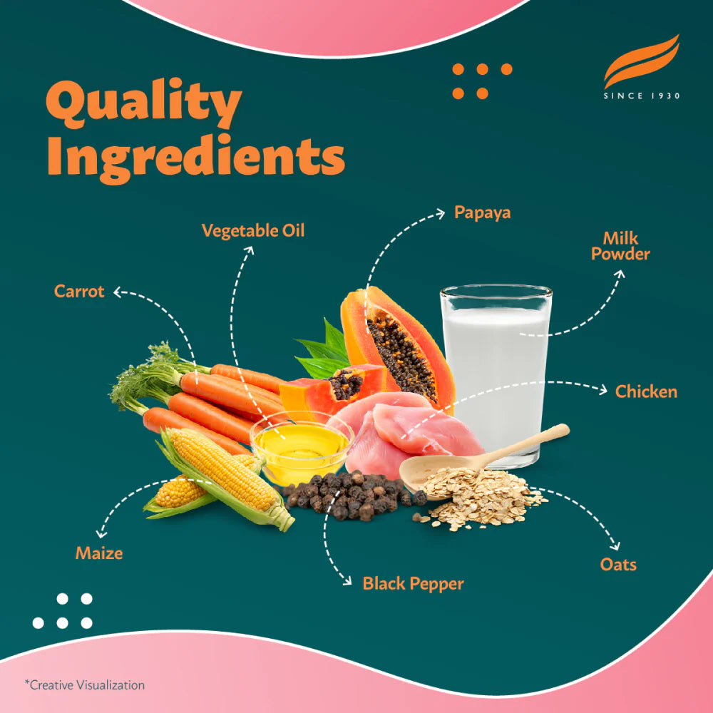 Good for Digestion, Immunity & Skin - This food has additionally Carica papaya that helps release digestive enzymes, Piper nigrum (black pepper) that supports immunity by enhancing efficiency on nutrients & vena Sativa (Oats) known for maintaining good skin health.