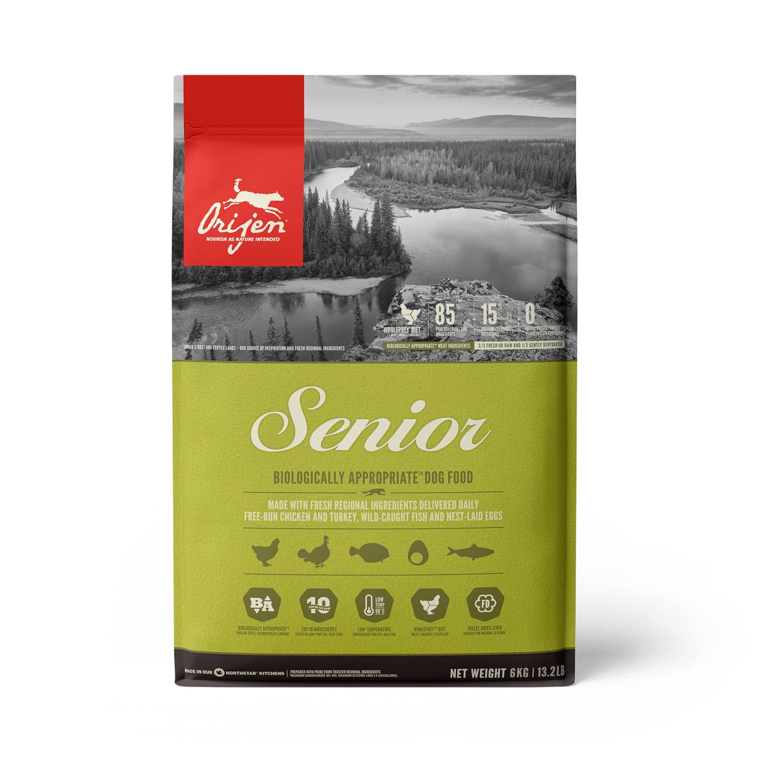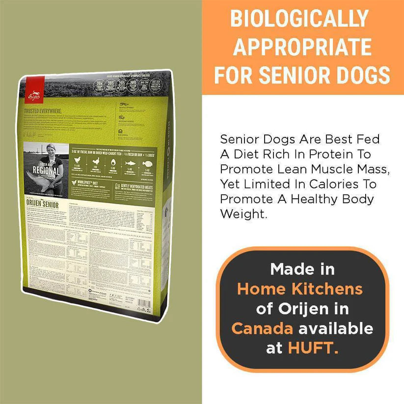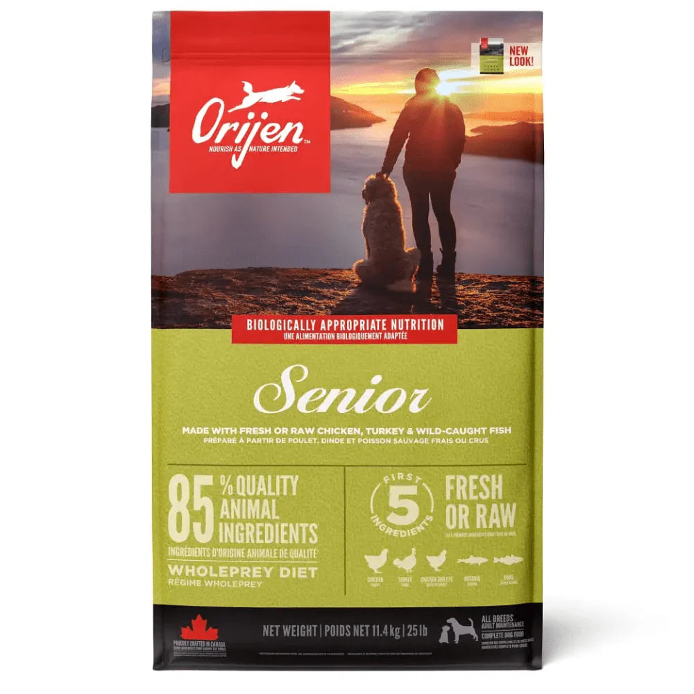 Orijen Senior Dry Dog Food is a complete dog food designed to fulfil the nutritional requirements of mature dogs. This dog food consists of a balanced proportion of different animal protein sources that boost the overall well-being of senior dogs and help build strong, lean muscles. It follows the WHOLEPREY™ concept, which bases your dog's food around the natural nutritional requirements of a dog in the wild. It is based on the concept of eating the entirety of prey, as your dog's ancestors would have, and this premium Canadian food consists of high content of meat and fish (85%). Two-thirds of this has been freshly prepared, with a third being delicately dehydrated at 90°, giving an extra portion of valuable protein and energy needed for growth and development. Collectively with a varied blend of fruits, vegetables and plant extracts, your dog is naturally supported with all the vitamins and minerals it needs to stay strong, healthy and happy into older age.