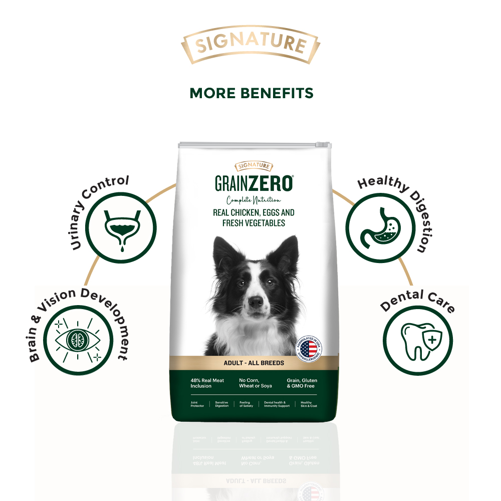Signature Grain Zero Adult Dry Dog Food is a complete food for adult dogs of all breeds. This diet has deboned chicken and eggs as the main ingredients providing a rich protein content for dogs to build muscle mass. Essential carbohydrates have also been added in the diet for giving a concentrated source of energy for your active dogs. Mainly, this is a 100% grain free dog food that suits even the dogs having allergies to specific ingredients. Also, there is a presence of Omega 3 and Omega fatty acids in optimum levels that encourage a healthy skin and shinier coat in the dogs. Besides, essential minerals like Calcium and Phosphorus have also been added in the diet for keeping strong bones and joints for excellent mobility. Lastly, the vital antioxidants in the diet boost immunity in your dogs to keep infections and diseases at bay.