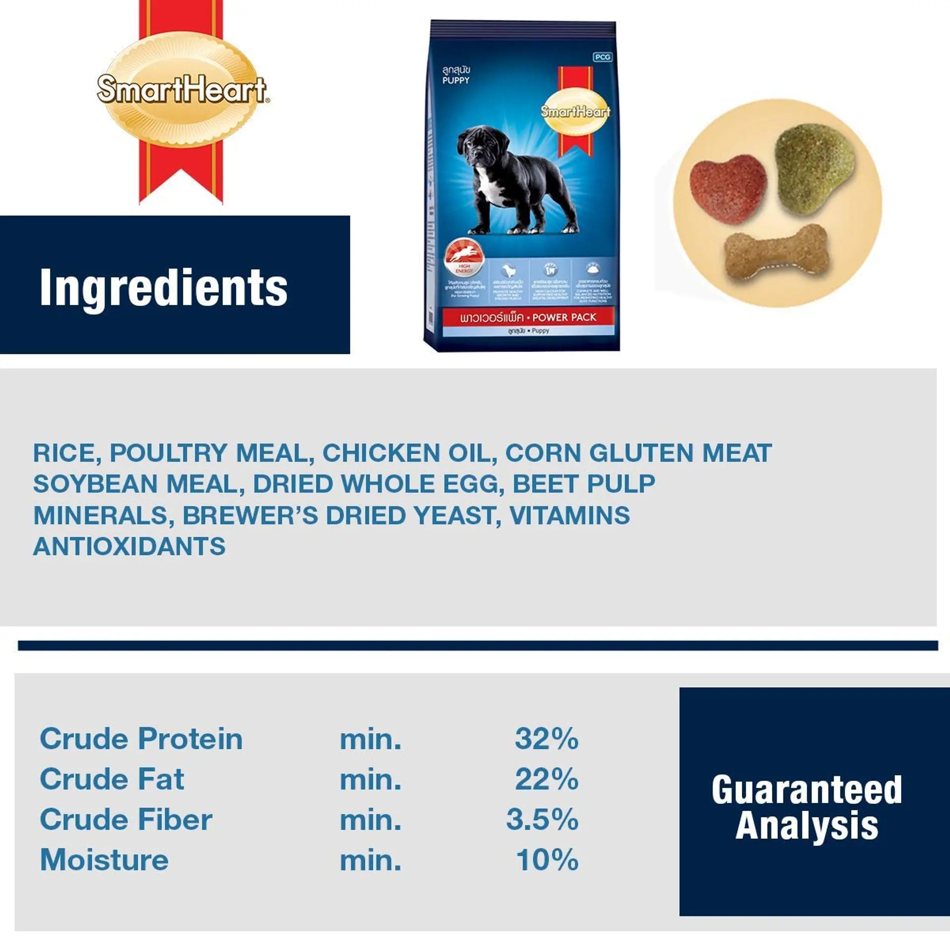Growing puppies of all breeds need a power-packed diet for building lean muscle mass and strength. As they have a delicate digestive system, a bit of fibre in their food also proves beneficial. Smartheart Power Pack Puppy Dog Food 1 Kg has a nutritional profile that bolsters the overall health of puppies of all breeds. It has a protein content of 28% for building good muscle mass and endurance. Omega fatty acids in the diet give good nourishment to their skin and facilitate hair growth. Minerals like calcium and phosphorus are ideal for building strong bones and teeth. Rice being the major constituent of the diet, provides them with enough carbohydrates for keeping them energetic. Smartheart Power Pack Puppy is also rich in organic fibres for boosting digestive health and to maintain an ideal weight. Supplements like Vitamin E and Selenium in the food keep your puppies immune against infections and diseases.