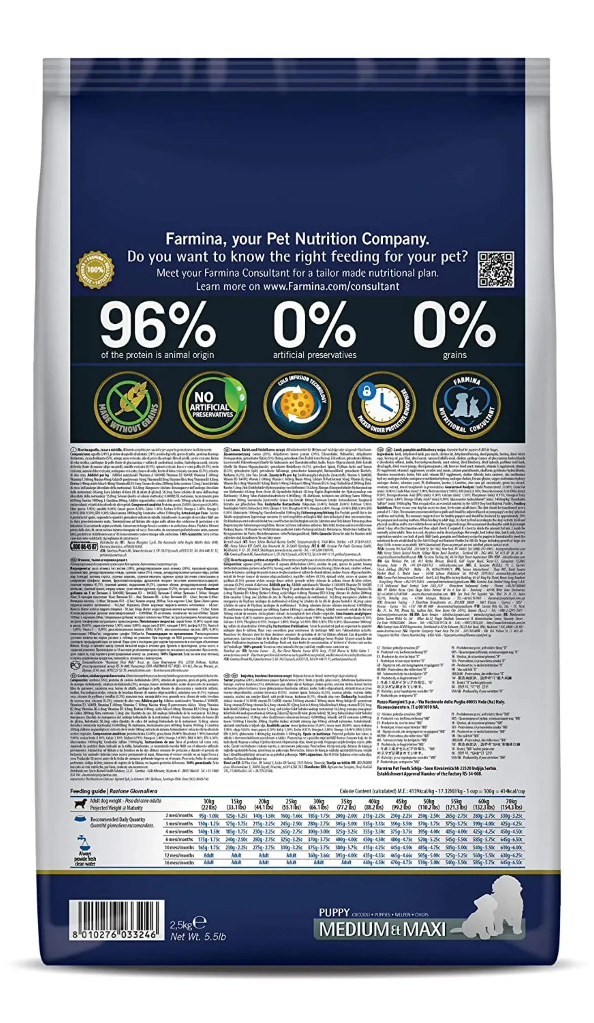 Farmina N&D Pumpkin Grain Free Lamb and Blueberry Medium & Maxi Puppy Dog Food is a complete puppy food designed for medium and large-breed dogs. This diet suits puppies of breeds like Bull Dog, Beagle, Cocker Spaniel, Labrador, Golden Retriever, German Shepherd, Rottweiler, Boxer, etc. This dog food can also be served to gestating and breast-feeding bitches of the same breed. The food has a rich protein content from high-quality lamb meat that helps build lean muscle mass in the puppies. Pumpkin, as the main ingredient of this dog food, provides natural fibres for boosting the overall digestive health of the dogs. The blueberry present in the diet offers natural antioxidants for building a strong immune system in the puppies. Farmina N&D Pumpkin Grain Free Lamb and Blueberry Medium & Maxi Puppy Food has a low glycemic index, which keeps a healthy body weight in the pups and also prevents diabetes.