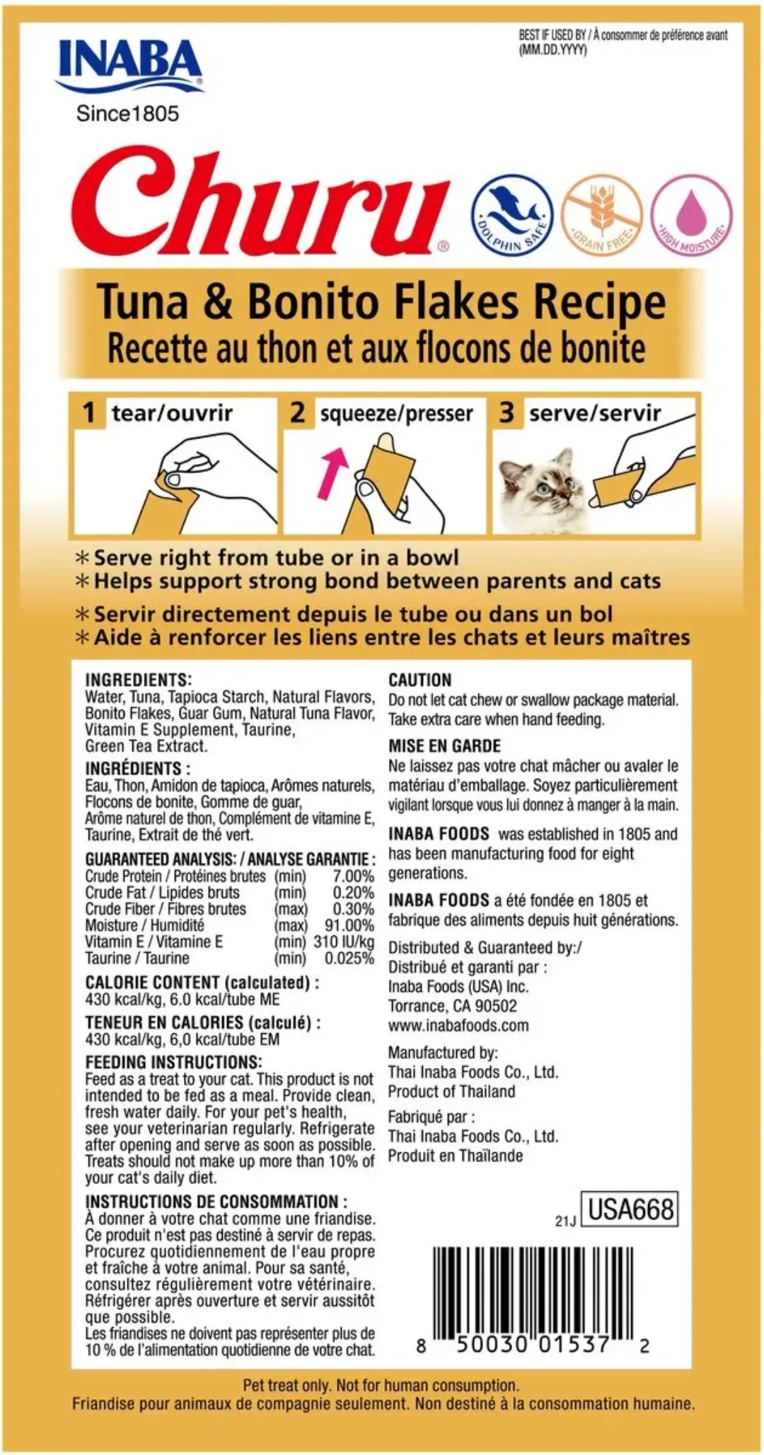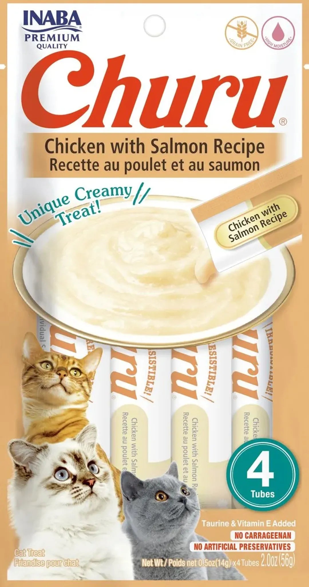Your kitty will be thrilled to have Inaba Churu Chicken with Salmon Recipe Creamy Puree Grain-Free Lickable Cat Treats at their disposal! These delicious purees are made from quality ingredients, like farm-raised chicken and salmon, and each pouch contains a scrumptious purée that's 91% moisture. As an added bonus, it has only six calories per serving and does not contain any grains, preservatives, carrageenan, or artificial flavors. Furthermore, this purée is fortified with taurine for improved vision, digestion, and heart health, vitamin E to boost the immune system, and green tea extract as an antioxidant. You can hand-feed your pet these treats, use them as a topper for cat food, or disguise medications. Suitable for felines of all ages, Inaba Churu makes snack time enjoyable for both you and your cat.