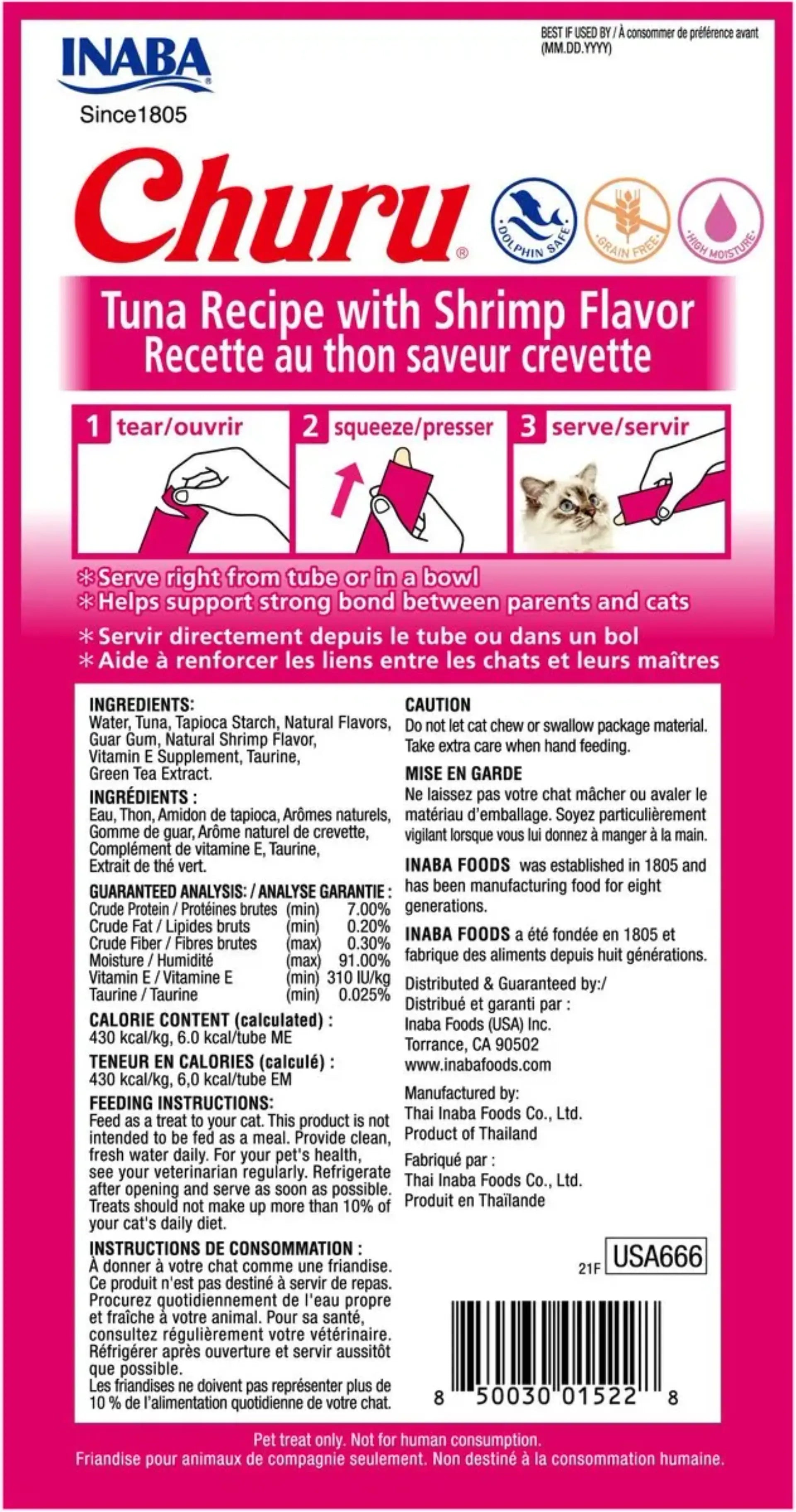 Your cat can’t wait to get their paws on Inaba Churu Tuna Recipe with Shrimp Flavor Creamy Puree Grain-Free Lickable Cat Treats! Like all Churu treats, this creamy purée is made from high-quality ingredients including wild-caught tuna and natural shrimp flavor. Each pouch contains a mouthwatering purée that’s both healthy and hydrating with 91% moisture and six calories per serving. They contain no grains, preservatives, carrageenan or artificial flavors. Plus, Inaba added taurine for vision, digestion and heart support, vitamin E to promote a strong immune system and green tea extract as an antioxidant—so these are a treat you can feel good about feeding your cat. Designed to be hand-fed, you can use Churu to help calm the feistiest of outdoor feral or treat your pampered indoor pussycat. They can also be used as a cat food topper or to disguise medications. Purr-fect for cats of all ages, Inaba Churu makes snack time fun for you and your feline friends.