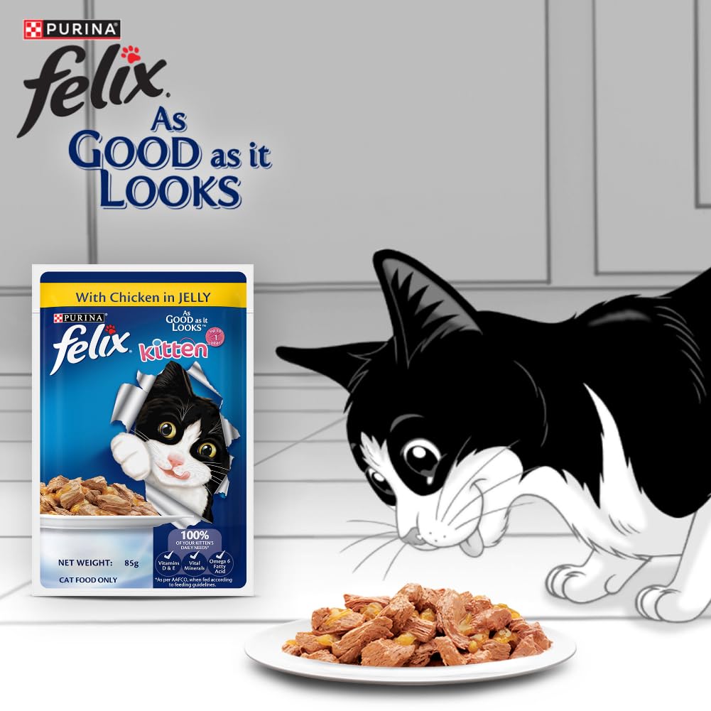 • Purina Felix has delicious tender meaty chunks Chicken in jelly.