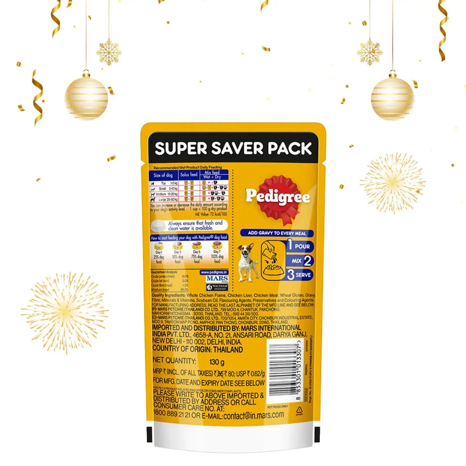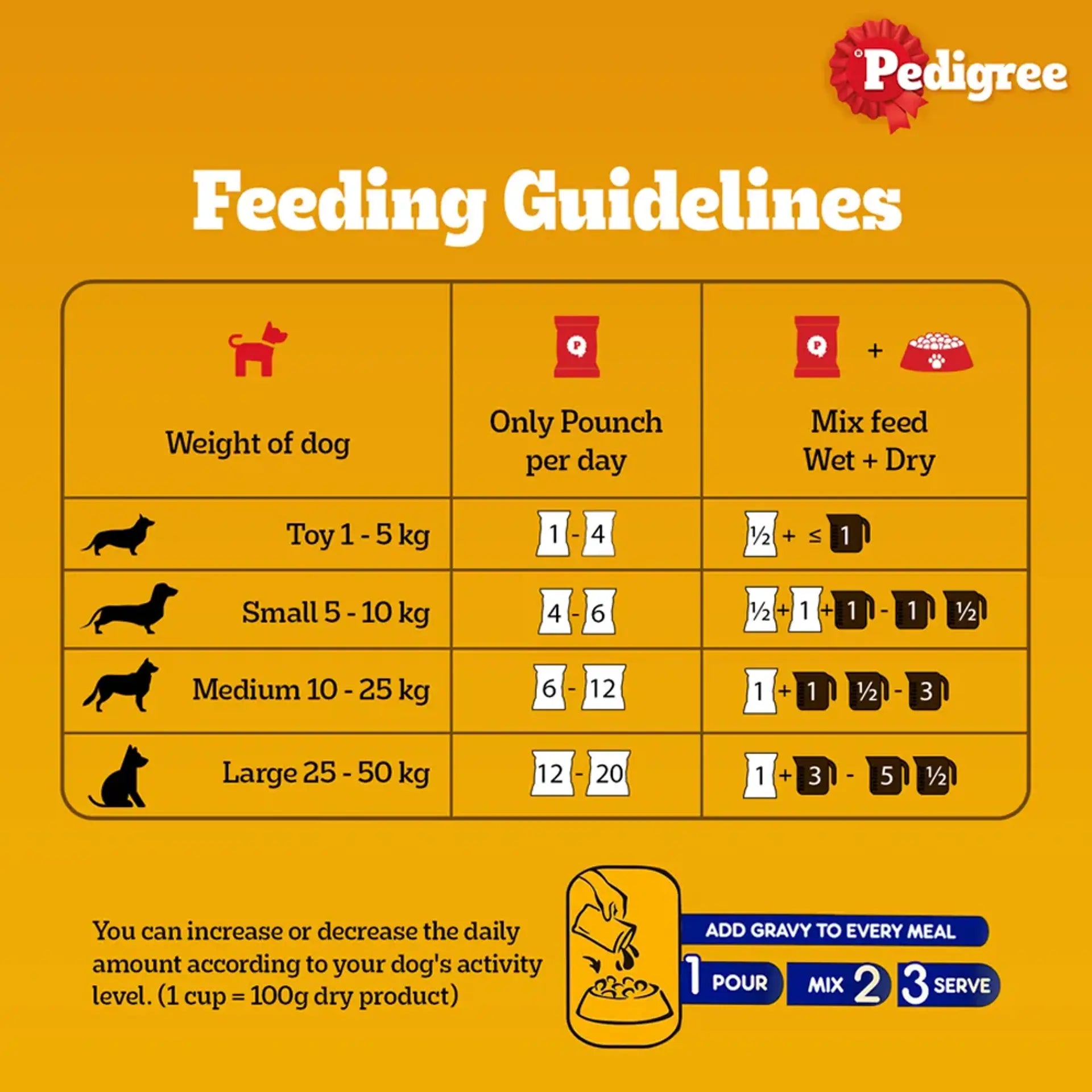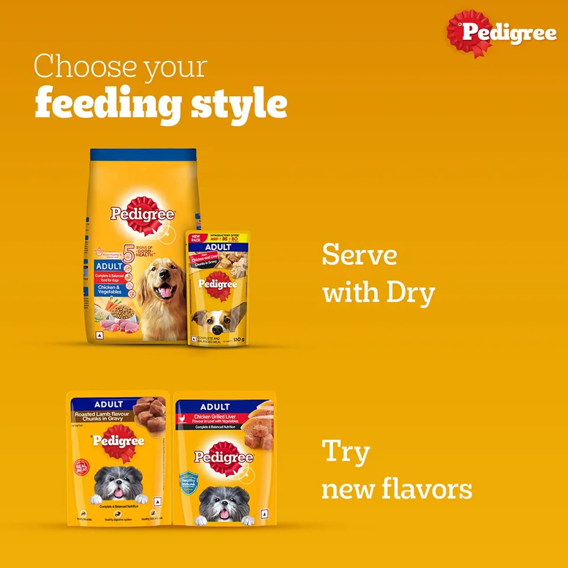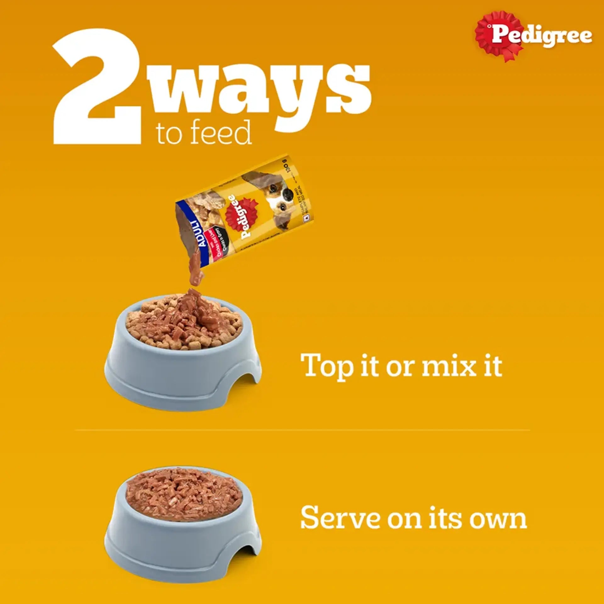 Pedigree Adult Chicken and Liver Chunks is a top-quality gravy food at PetsWorld that maintains excellent health and well-being in dogs of all breeds. It has ample protein that helps endow the dogs with a shiner coat and healthy skin. Moreover, an ideal blend of Calcium to Phosphorus ratio maintains strong bones and joints in your dogs. The food also has organic fibres that support higher nutrient absorption, besides increasing your dog's digestive health. Pedigree Adult Chicken and Liver Chunks consist of Vitamin E as a natural antioxidant that bolsters the immune system of dogs, keeping them safe against illnesses.