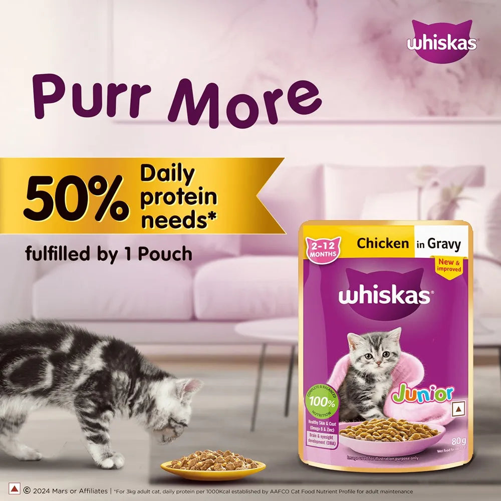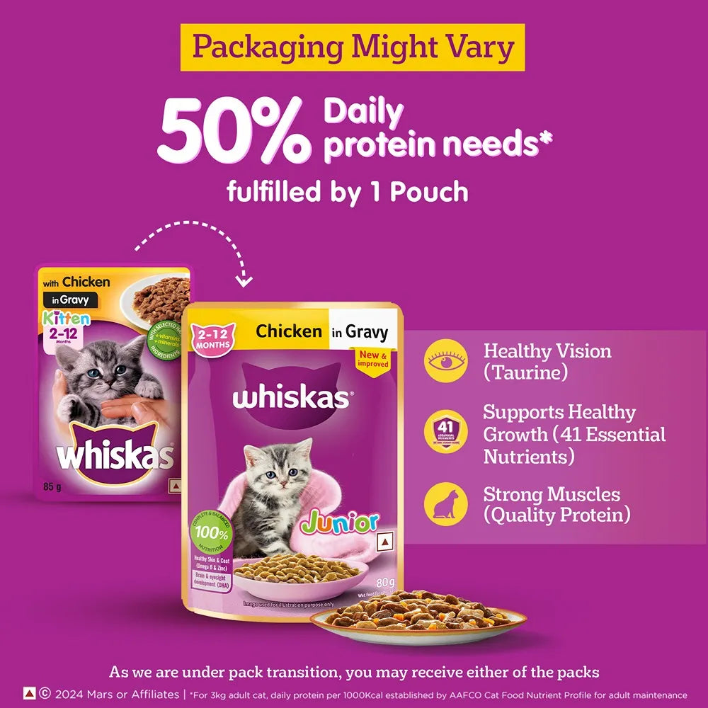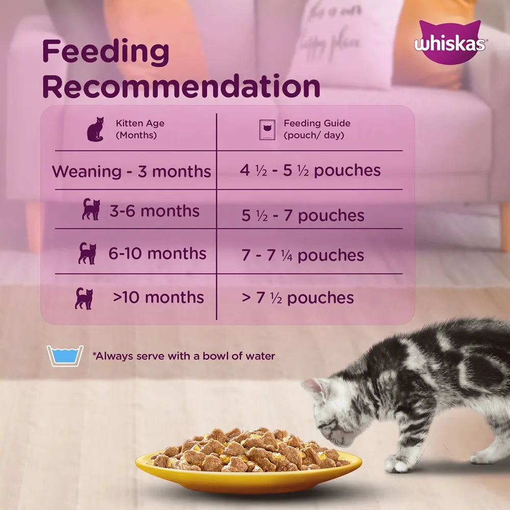 Whiskas Kitten Wet Cat Food Chicken in Gravy is one of the best cat foods for kittens of all breeds. It comes in a gravy format which plays a huge role in improving the urinary tract health of the cats. The tempting aroma of the Chicken proves yummy to almost every cat. Kittens highly benefit from a chicken-based diet as it gives them enough protein content to build muscle mass as well as endurance. Also, the Omega fatty acids of the diet boost the eyesight of the cats and also treat the problem of inflammation in them. This cat food consists of natural fibres which helps a lot in boosting the digestive health of the cats while also ensuring a higher nutrient absorption in them. Whiskas Kitten Wet Cat Food Chicken in Gravy has a high moisture content that keeps your little felines well hydrated.