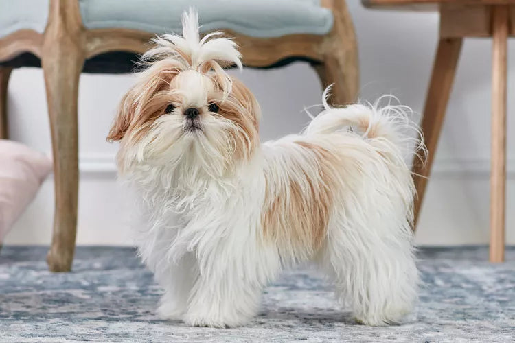 The coat of the Shih Tzu is characterized by long and abundant hair, which may be slightly wavy, especially in length. Though, there are several colour variations, they generally have a white stripe on the front of the head and white fur on the tail.Despite Shih Tzu's thick coat, you may not notice loose hairs around the house, but they do shed at certain times of the year. Knots can often happen when not brushed properly, so many owners end up opting for baby grooming, which in addition to giving adults a puppy-like appearance,makes it easier for you to maintain as well. Regular bath is essential for Shih Tzus in order to maintain excellent skin and coat health. Owners should know that a bad coat in these dogs can expose them to hair problems like matting and tangling, which eventually leads to its breakage. Hence, keeping Shih Tzu's coat neat and clean is immensely important for maintaining the sheen and luxury of their double coat.