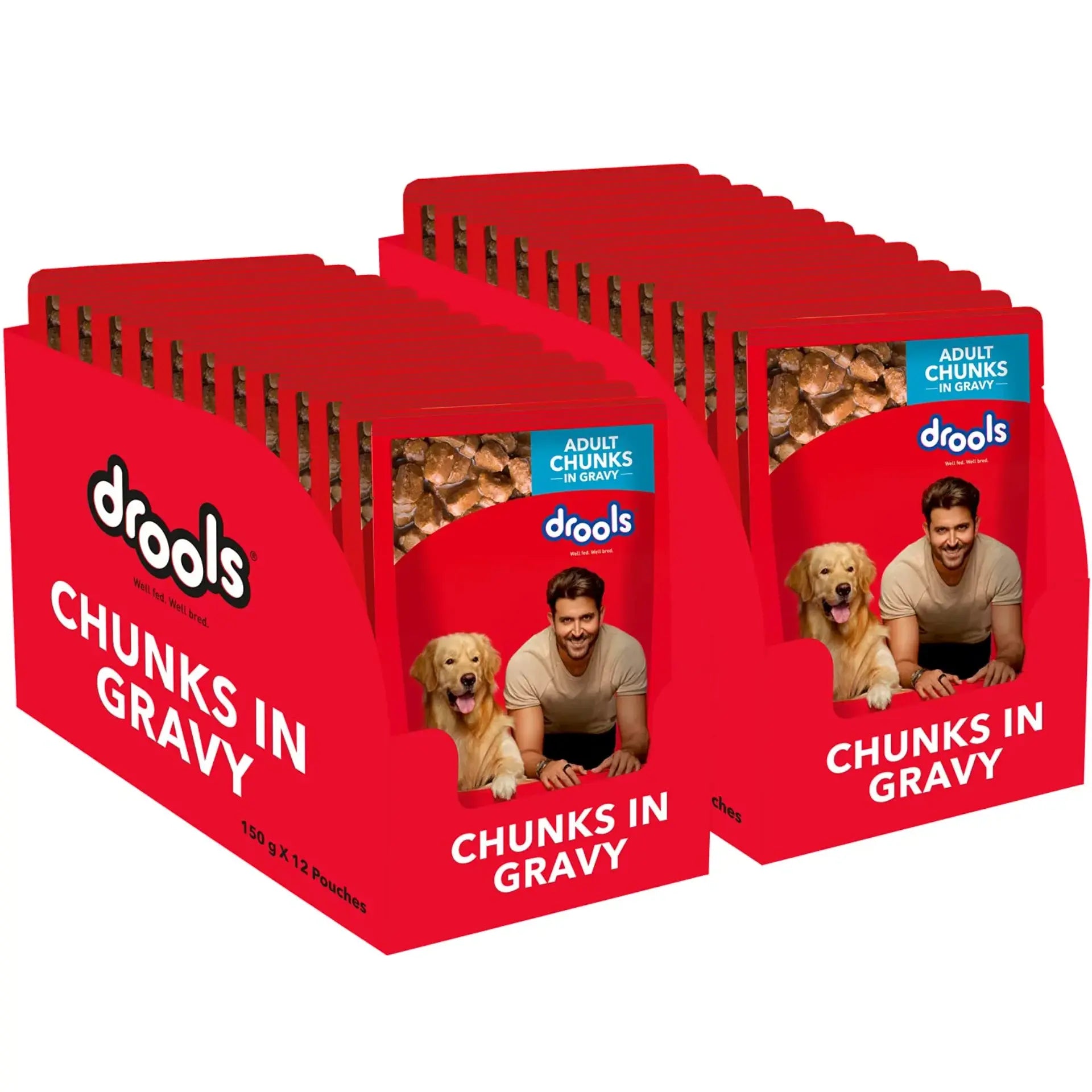 DROOLS Real Chicken & Liver Chunks in Gravy is a wholesome wet dog food providing all the health and nourishment to adult dogs above 1 year old. Drools chicken chunks gravy has DHA essential fatty acid which improves learning skills and helps maintain the overall health of the coat. The food also helps to eliminate dental problems like Tartar and Plaque buildup. A good proportion of natural fibre in the diet boosts other overall digestive mechanisms and supports higher nutrient absorption. A moisture content of 85% keeps the canine well hydrated. Drools wet food offers Omega 3 and Omega 6 essential fatty acids for preventing inflammation and to control blood clotting.