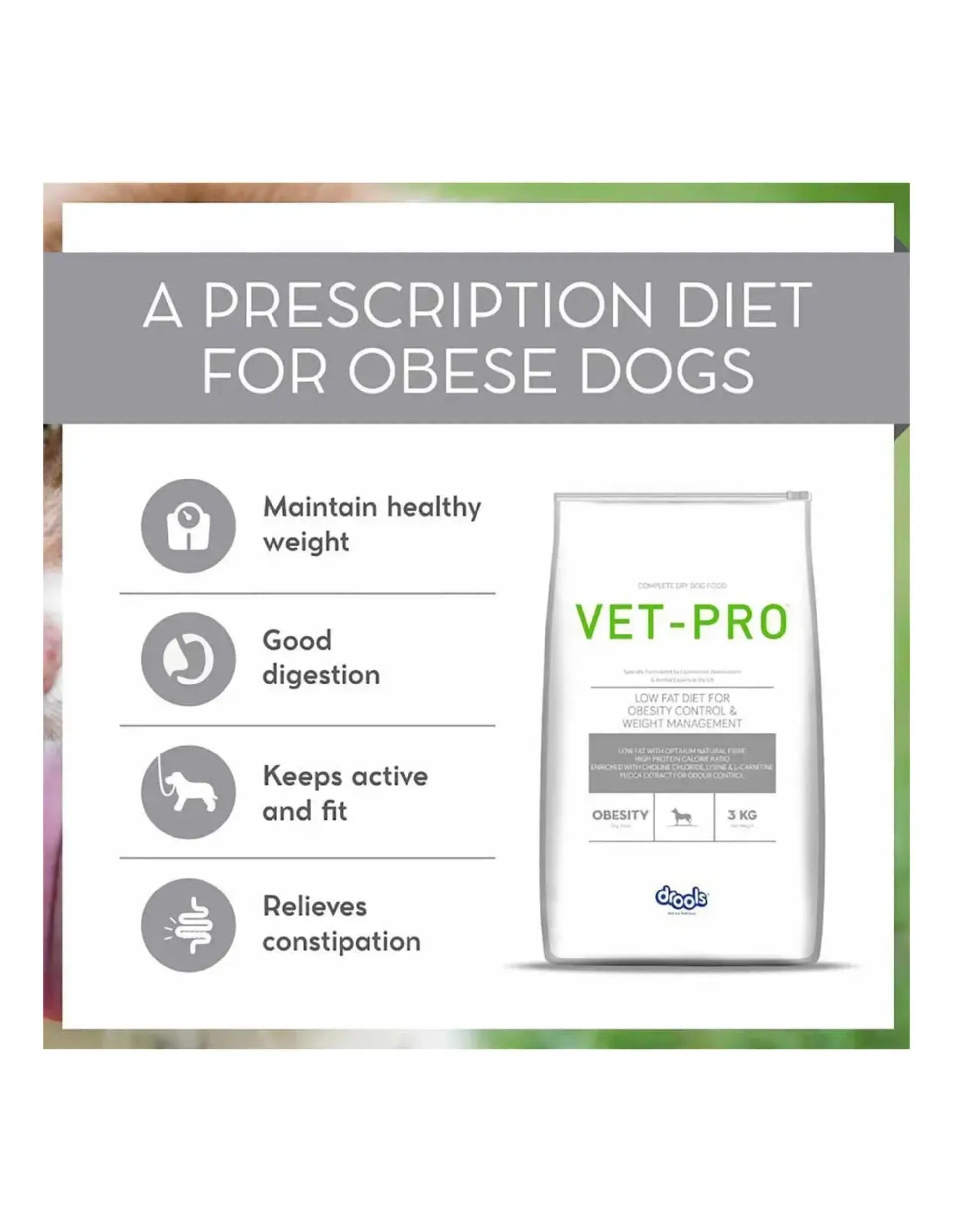 DROOLS Vet Pro Obesity is a highly nutritious prescription dog food specialling designed for treating the problem of obesity and constipation in adult dogs of all breeds. Having a low-fat content in the diet ensures a lower calorie intake. Essential minerals like Lysine, L-Carnitine and Choline Chloride metabolise fat deposits in the canine’s body. A balanced protein-to-calorie ratio sustains overall growth and development. A healthy fibre content offered by DROOLS Vet Pro Obesity satisfies hunger and maintains a healthy digestive tract. Taurine present in the diet keeps good cardiac function. Fructo-oligo-saccharides is an organic prebiotic for detoxifying the dog’s body and for supporting a healthy gut. Yucca extract lowers the stool odour of the dog.