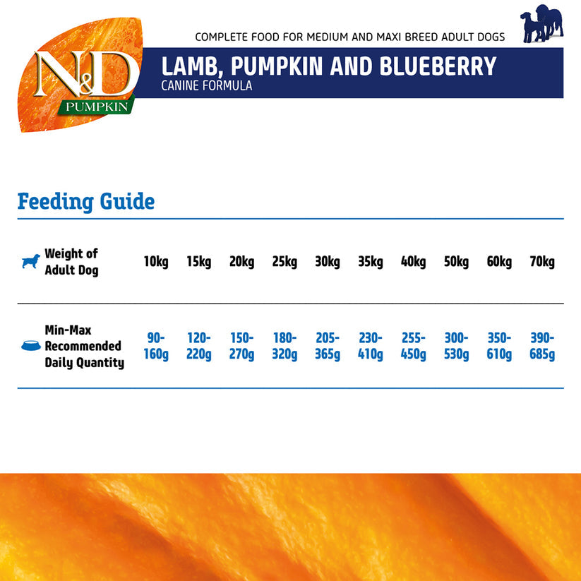 Farmina N&D Pumpkin Grain Free Lamb and Blueberry Medium & Maxi is a complete dog food designed for maxi and medium breed dogs. You can feed this diet to dogs like Beagle, Bull Dog, Labrador, Rottweiler, German Shepherd, Golden Retriever, Boxer etc. This dog food consists of a rich protein content from Lamb meat that helps develop lean muscle mass in these dogs. Pumpkin, which is a natural source of fibre, supports healthy digestion in dogs, and a higher nutrient absorption as well. This diet has the goodness of Blueberry which provides natural antioxidants for boosting your dog’s overall immunity.