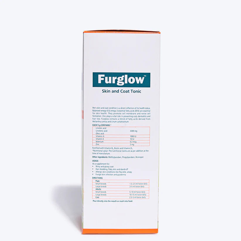 A radiant skin and coat reflect a dog's overall health. Himalaya Furglow Oral Coat Conditioner 200 ml contain essential fatty acids like Omega 3 and Omega 6 for reducing inflammation and to give a healthy and lustrous coat. Selenium counters free radicals in the body thereby boosting the skin's natural barrier. A balanced proportion of vitamins and minerals strengthen bones and joints of the canine. Zinc is an excellent anti-inflammatory for lowering the pain persisting in the joints and to decrease swelling in the body. The shampoo controls excessive hair fall and removes flaky skin which causes dandruff. Himalaya Furglow Oral Coat Conditioner has biotin for stimulating skin and hair growth and to reduce itching in dogs.