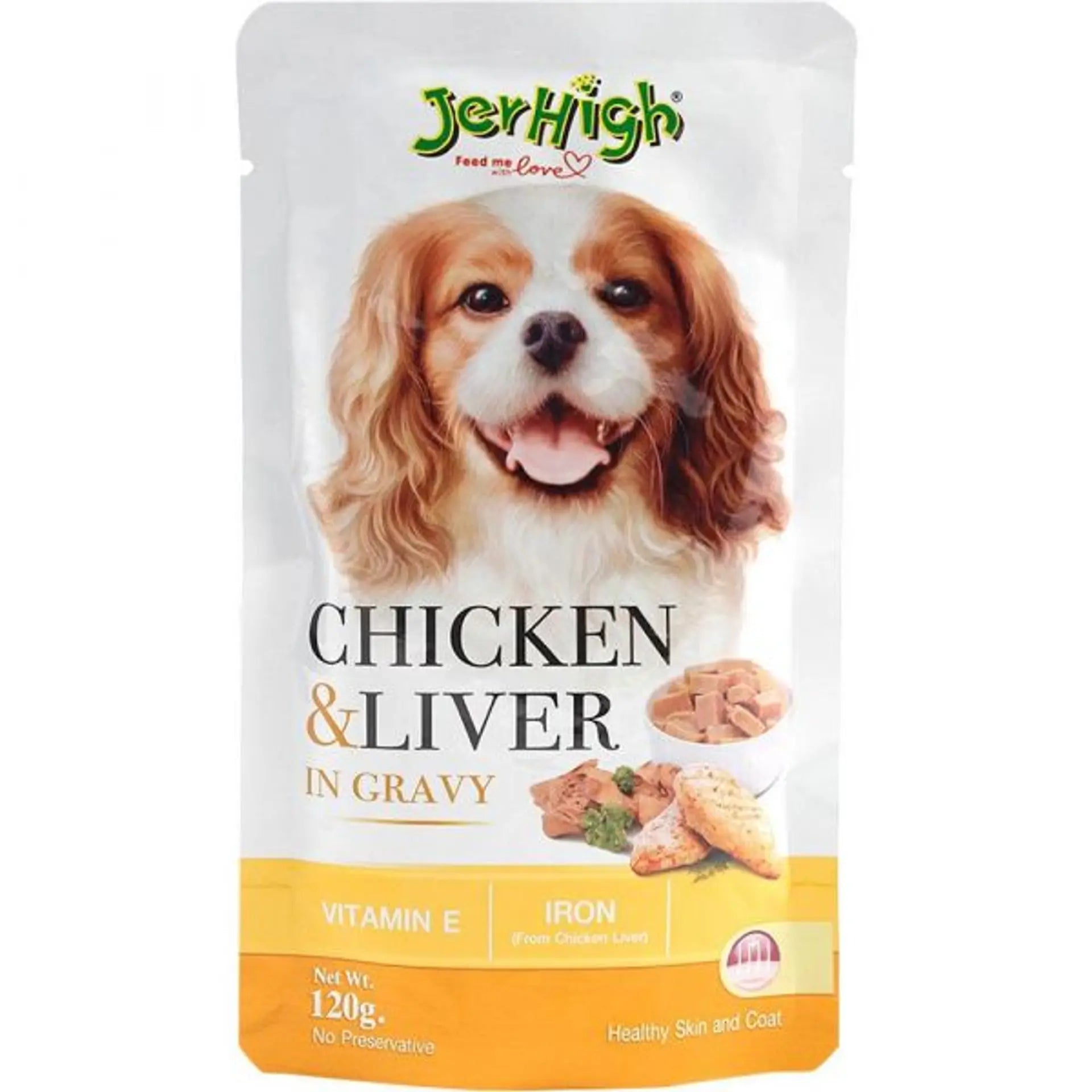 Jerhigh Chicken and Liver in in Gravy Dog Food 120 gms is a highly nutritious wet dog food having luscious Roasted Duck in Gravy flavour makes it delectable for all dog breeds. Extensive protein content in the meal promotes overall strength and endurance in canines. Formulated from Real Chicken meat and Duck, the food is also rich in Omega 3 fatty acids and Zinc which ensures good skin and coat health in canines. It also helps in alleviating pain produced in the bones and joints. Zinc maintains the integrity of the skin and gives anti-ageing effects in dogs. 82% moisture content of the meal ensures that your canine is well hydrated. A decent amount of fibre has also been added for promoting good bowel movement in dogs.