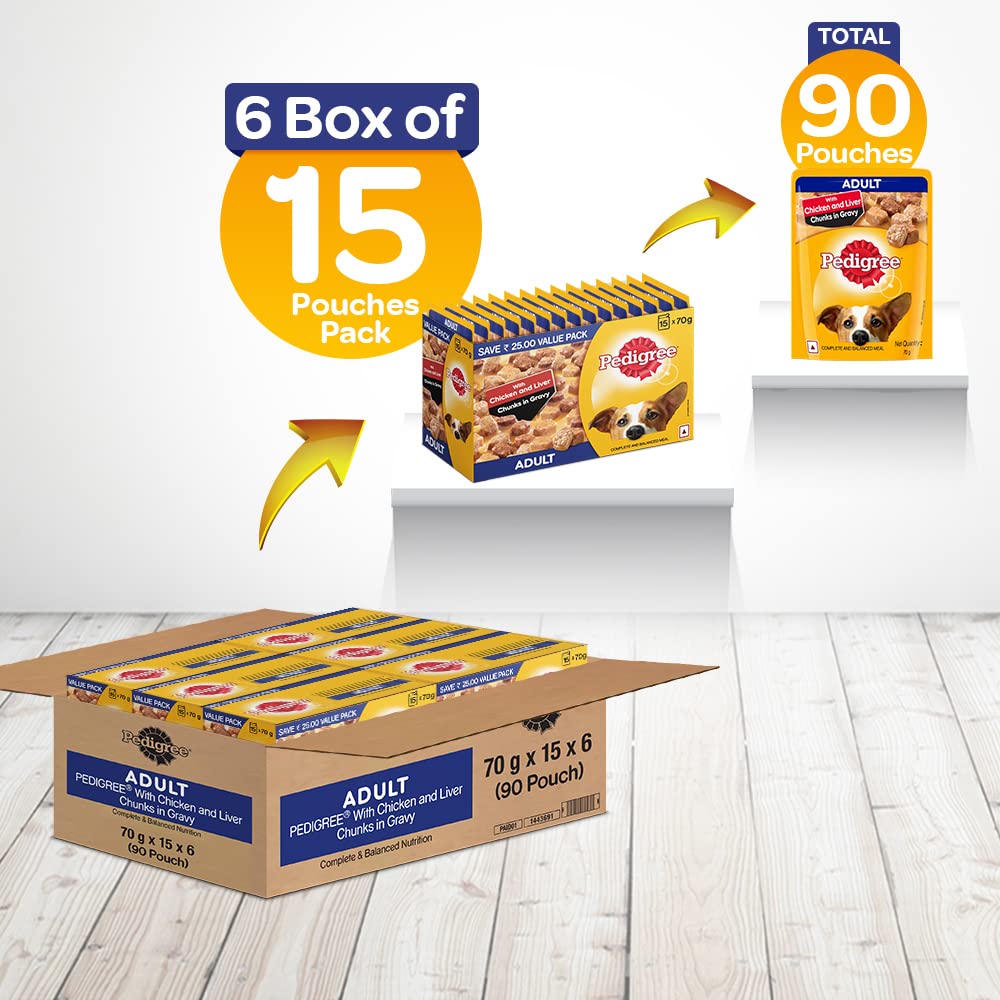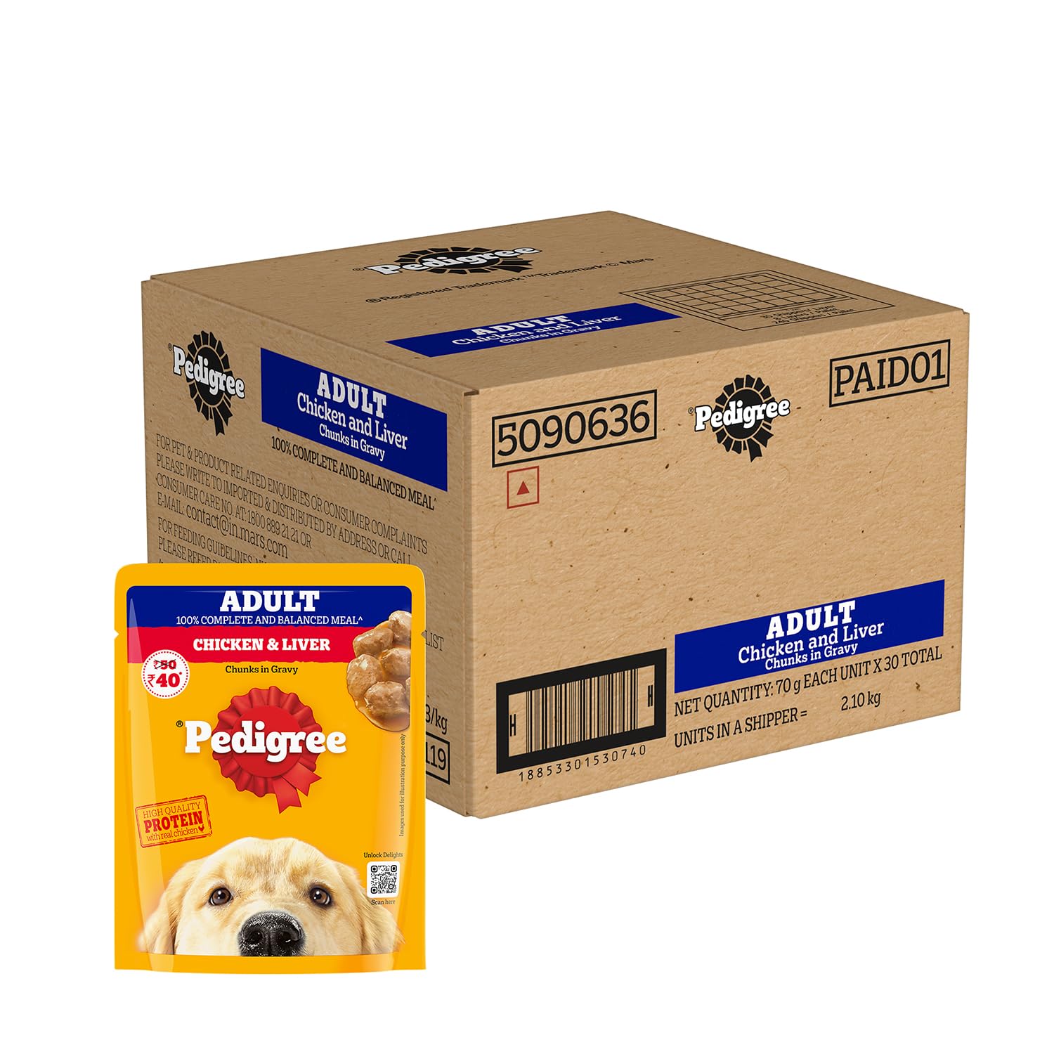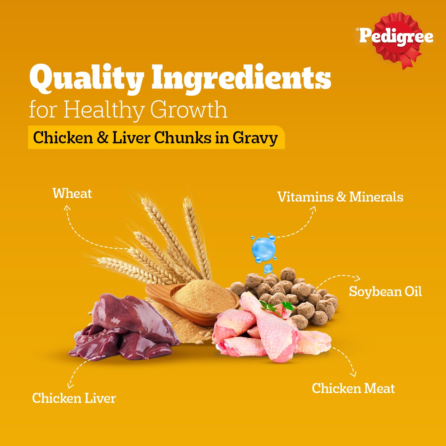 Pedigree Adult Wet Dog Food, Chicken & Liver Chunks in Gravy, is a top quality gravy food available at PetsWorld that maintains excellent health and wellbeing in dogs of all breeds. It has got ample amounts of protein that helps in endowing the dogs with a shiner coat and a healthy skin. Moreover, an ideal blend of Calcium to Phosphorus ratio maintains strong bones and joints in your dogs. The food alsCo has organic fibres that support a higher nutrient absorption, apart from increasing the digestive health of your dogs. Pedigree Adult Chicken and Liver Chunks consist of Vitamin E as a natural antioxidant that bolsters the immune system of the dogs, keeping them safe against illnesses.