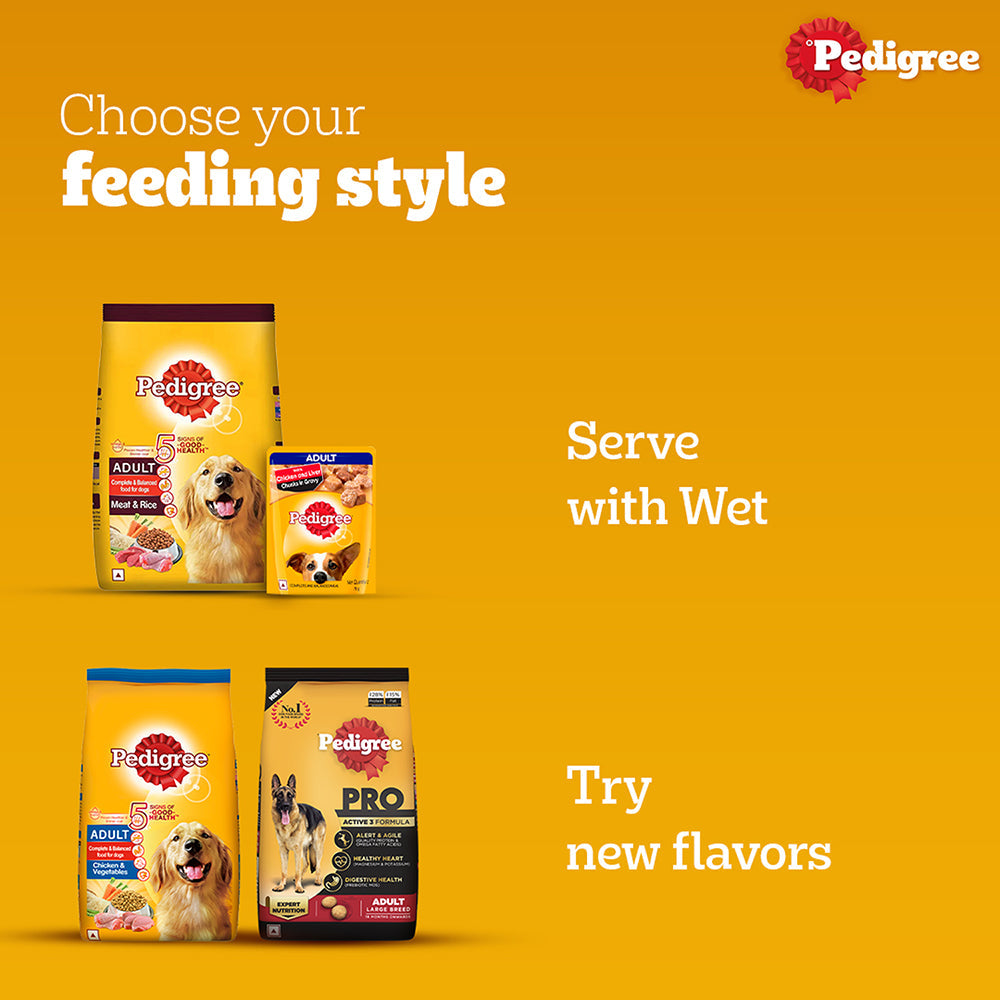 Pedigree Meat and Rice Adult Dog Food is a top-quality dog food that completes the overall energy demand in adult dogs. This dog food variety is enriched with vitamins and minerals that boost the general wellness of your dogs. The diet also consists of essential fatty acids like Omega 3 in balanced levels that help in producing healthy skin and shiny coats in all dog breeds. The meal is also rich in high-quality protein that builds lean muscle mass, repairs body tissues and keeps them strong and athletic. It also contains dietary fibre to promote good digestion and ensure higher nutrient absorption in dogs. Pedigree Meat and Rice Adult Dog Food consists of essential minerals like calcium and phosphorus to keep bones and teeth in strong condition.