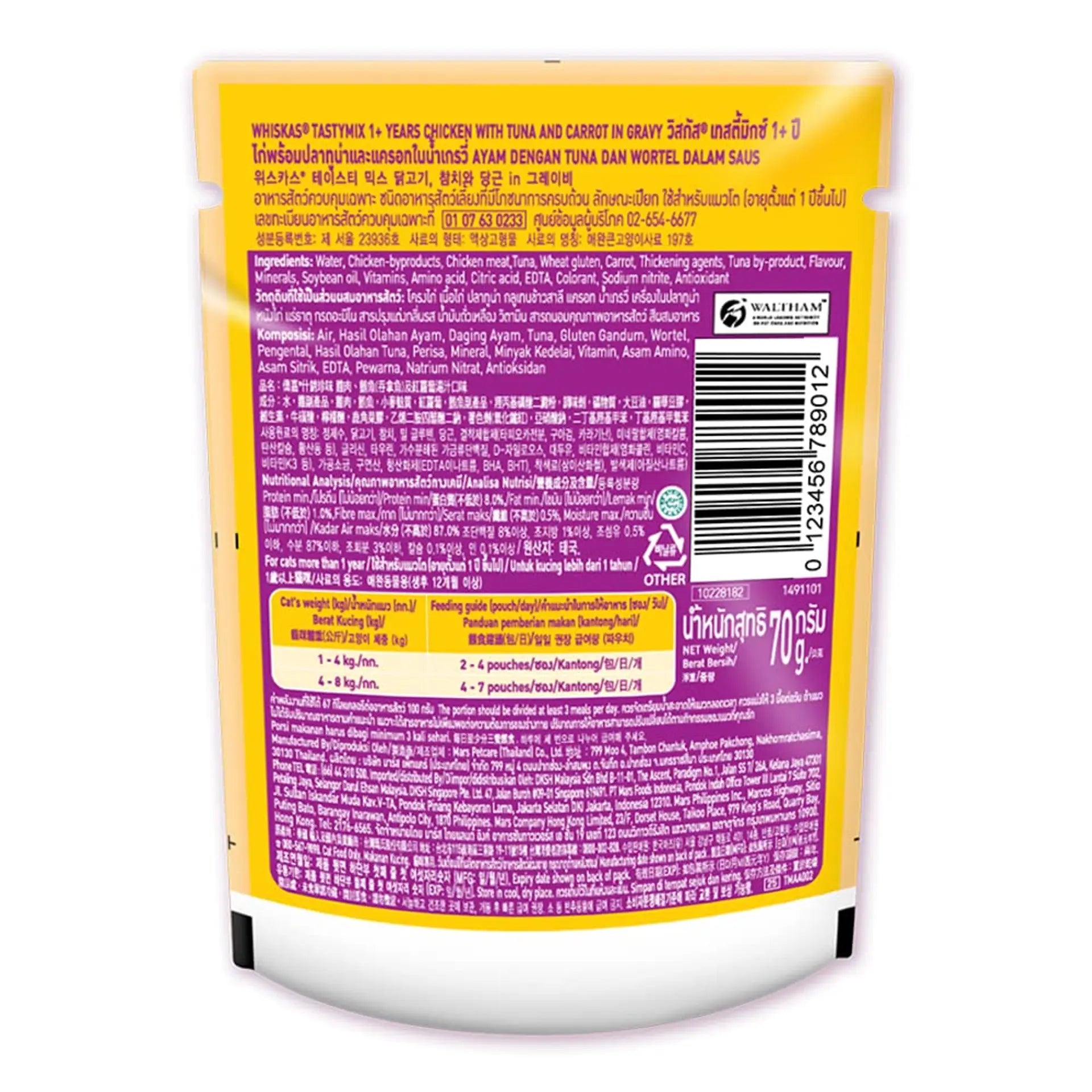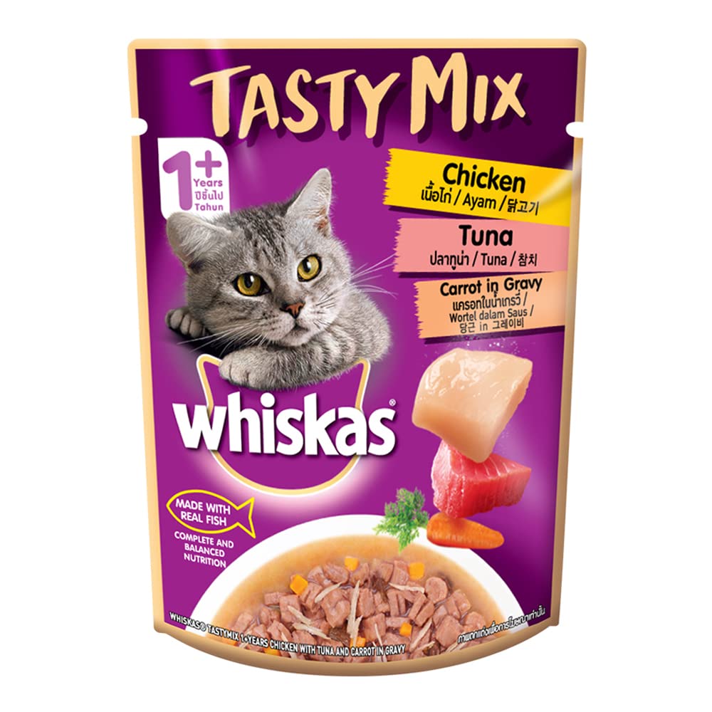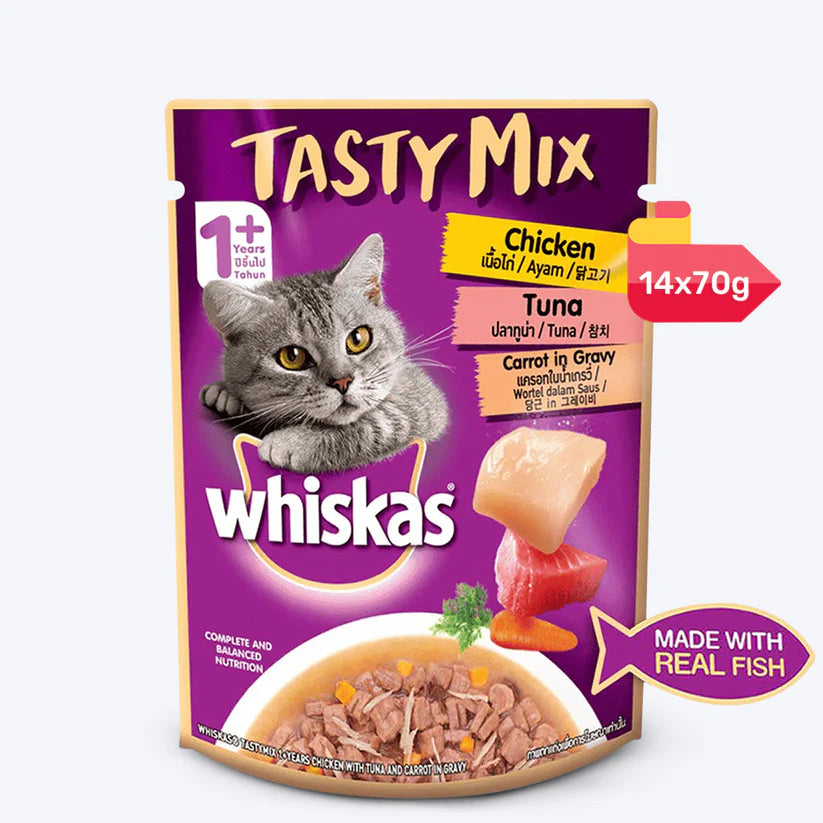 Whiskas Tasty Chicken Tuna Carrot Gravy is a premium branded cat food containing all the essential nutrients for fortifying the cats' overall health. It consists of real fish as the prime constituent providing cats with enough protein to build muscle mass and strength. Moreover, the diet contains Omega 3 fatty acids which are vital for healthy skin and coat in cats. Last but not least, Whiskas Tasty Chicken Tuna Carrot Gravy has Vitamin E as antioxidants that boost their immunity, helping them to fight infection and diseases.