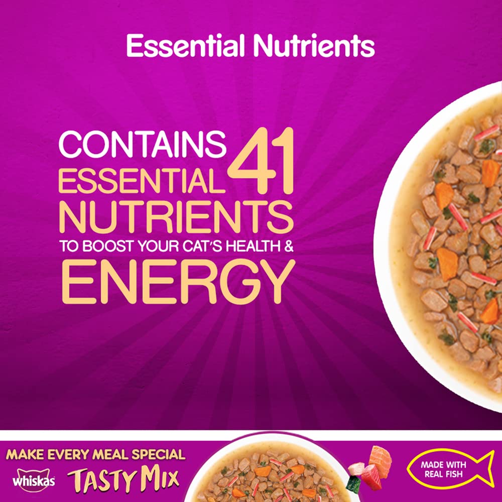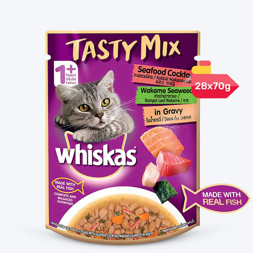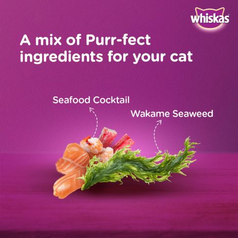 Whiskas Tasty Seafood Cocktail Wakame Gravy is a premium quality cat food available at PetsWorld that improves the overall health of your cats. It has Real Fish as the prime constituent that provides the cats with enough protein content to build strong muscle mass. On the other hand, Fish offers them essential fatty acids that soothe inflammation and promote excellent eyesight in them. This highly palatable gravy food consists of 41 essential nutrients that endow them with a strong defence mechanism. The food also contains natural fibres which are essential for ensuring excellent digestive health in the cats. Whiskas Tasty Seafood Cocktail Wakame Gravy has a good moisture content that keeps your felines well-hydrated during scorching heat. Don’t look further than this scrumptious diet if you are in search of cat food for tempting picky eaters.